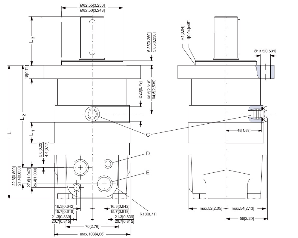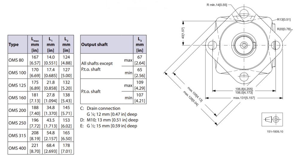 Silnik hydrauliczny planetarny OMS Danfoss z kołnierzem standardowym z czterema otworami mocującymi i wałkiem cylindrycznym 32mm. Silniki hydrauliczne Danfoss typ OMS to silniki o przenaczeniu przemysłowym do napędu urządzeń z mocą do 5-13kW i trybie pracy cięgłej.